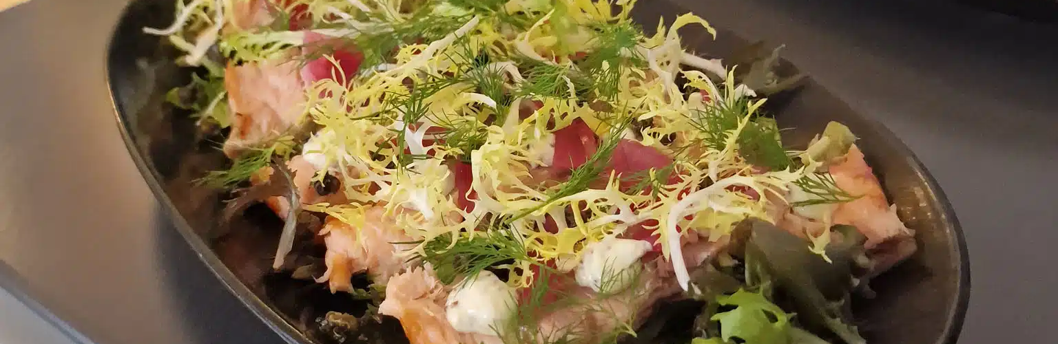 - Varmrøget laks på bund af sprød crips salat med syltet rødløg, sennepsmayo og friteret capers